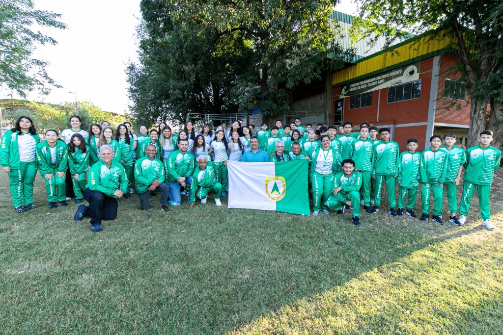 A imagem mostra os atletas que irão representar a capital no Campeonato Estadual de Desporto Escolar, com a comissão responsável pela delegação cuiabana.