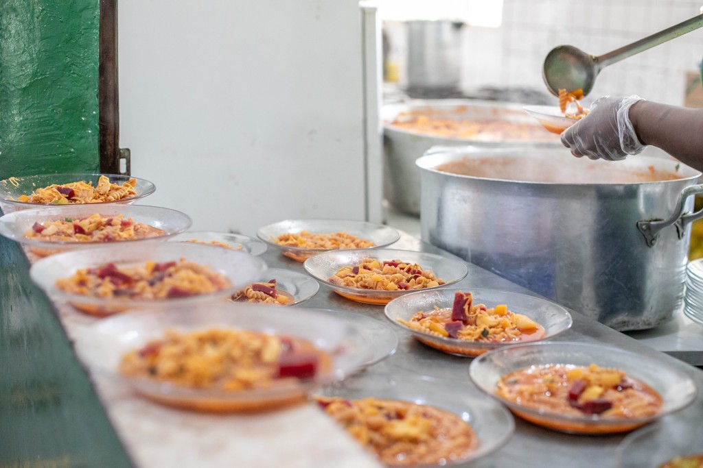 A foto ilustra pratos servidos com frango ao molho, verduras e macarrão numa cozinha de uma escola de Cuiabá. A alimentação será fornecida aos estudantes.