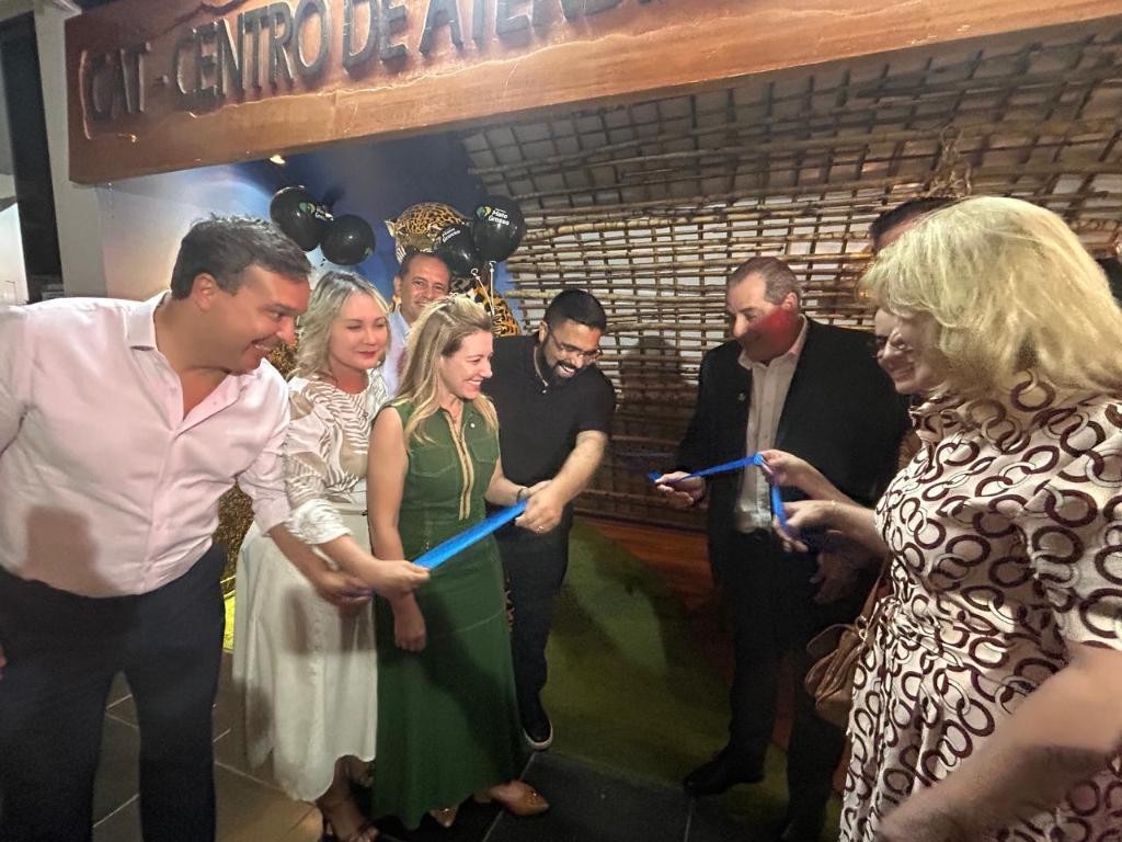 A imagem que acompanha a matéria mostra autoridades e representantes das esferas municipal, estadual e federal durante a cerimônia de inauguração do Centro de Atendimento ao Turista (CAT), no Aeroporto Internacional Marechal Rondon, em Várzea Grande.