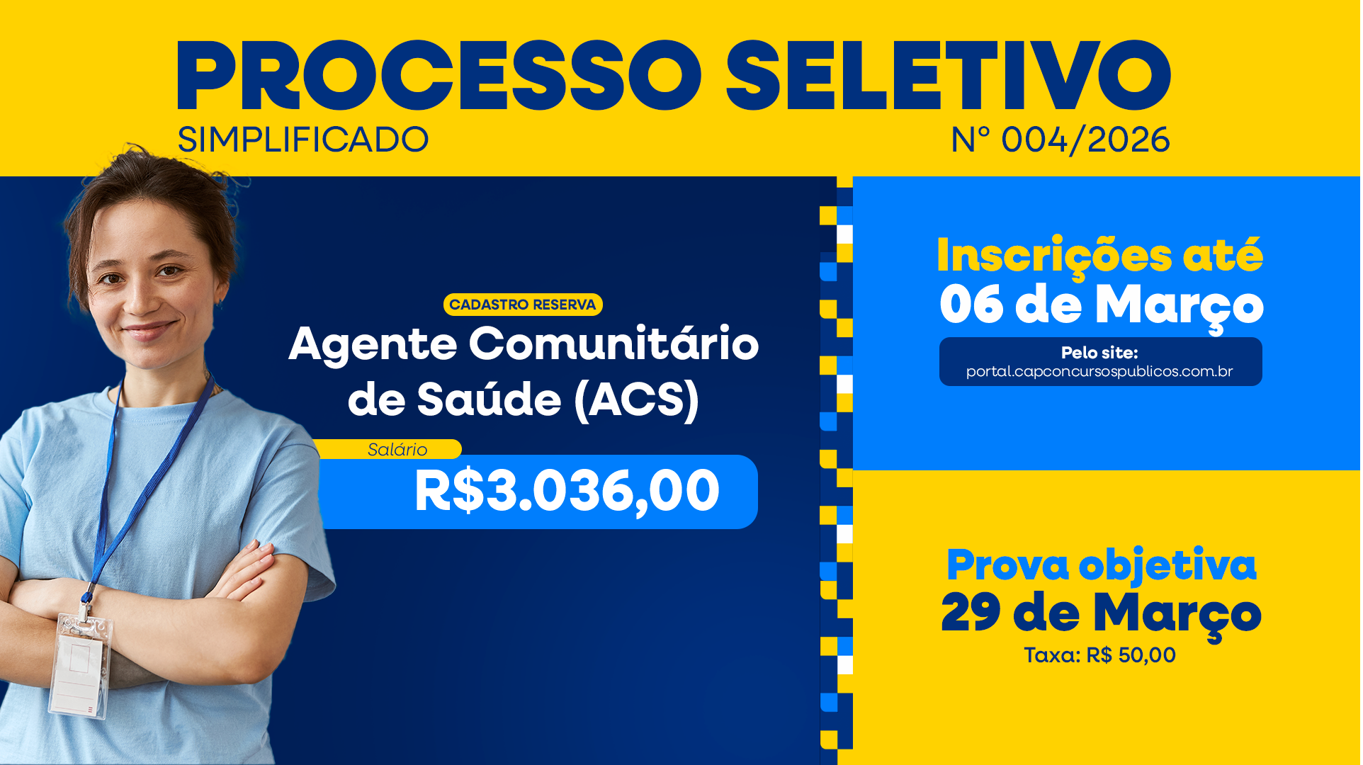 As inscrições serão realizadas exclusivamente pela internet no site da CAP Concursos, de 26 de fevereiro a 06 de março de 2026, e a aplicação da prova objetiva está prevista para o dia 29 de março de 2026.
