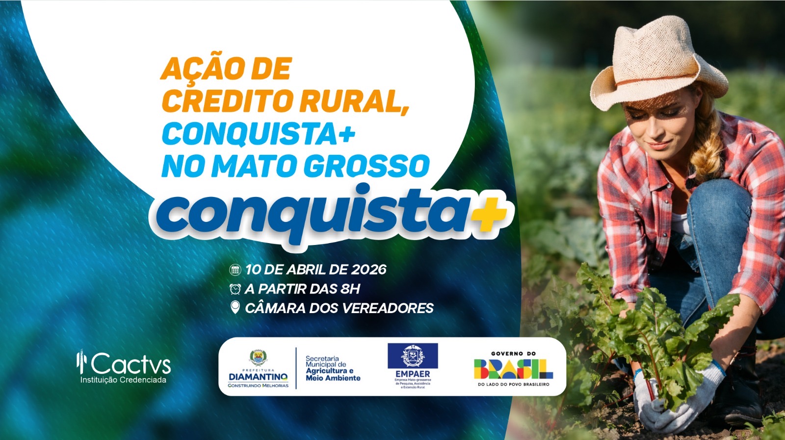 A Prefeitura de Diamantino, por meio da Secretaria Municipal de Agricultura e Meio Ambiente convida os produtores rurais do município para participarem do evento Conquista+, que será realizado no dia 10 de abril, a partir das 08h, na Câmara Municipal de Vereadores.