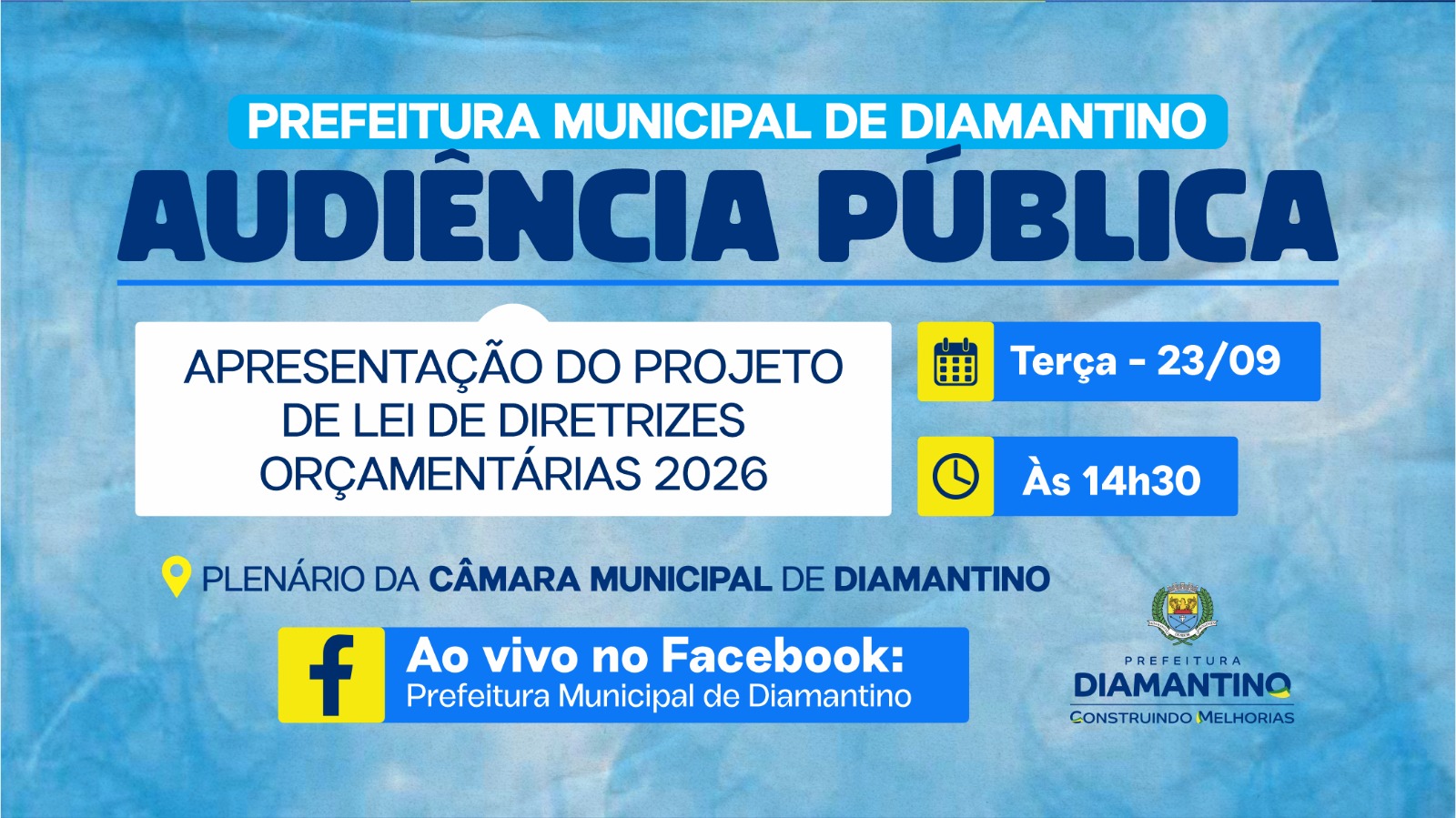 A audiência será realizada no dia 23 de setembro de 2025, às 14h30, no Plenário da Câmara Municipal de Diamantino – MT, com participação aberta a toda a população e às entidades representativas do município.