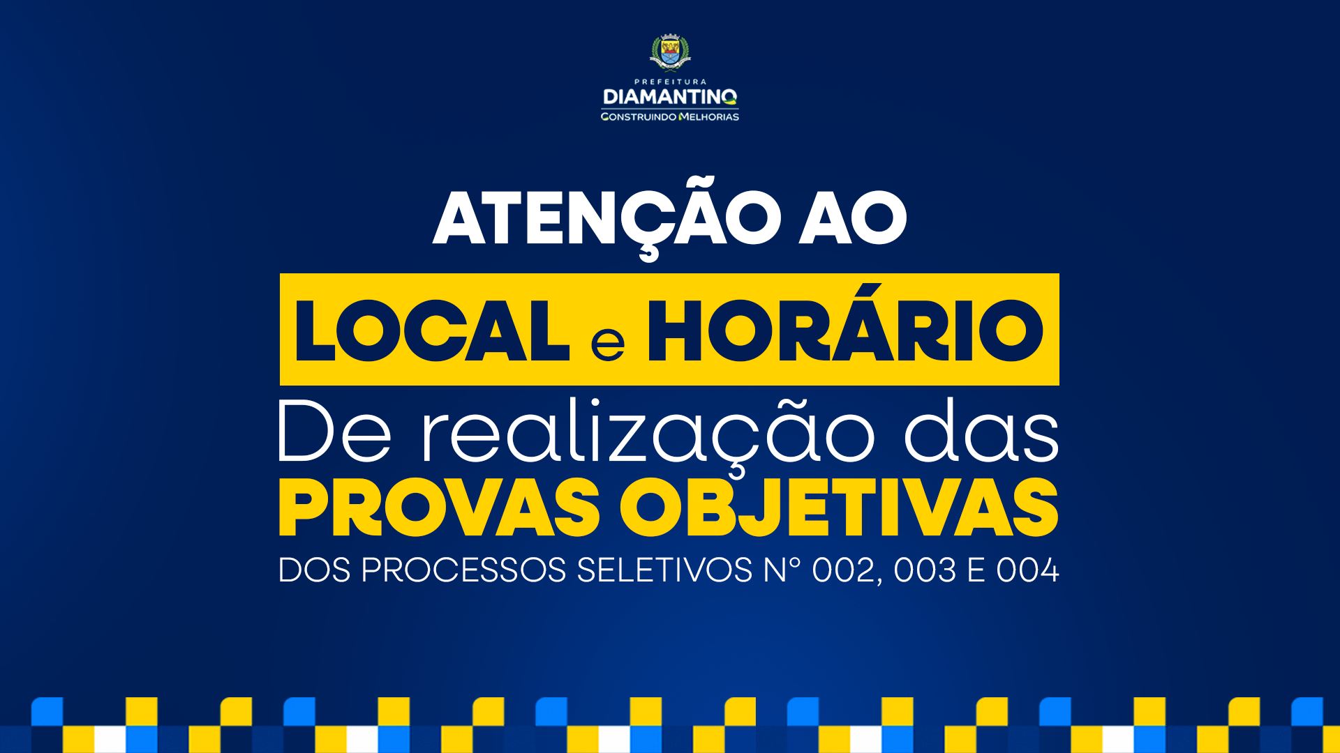 A Prefeitura de Diamantino, por meio da Secretaria Municipal de Administração informa que as provas dos processos seletivos públicos em andamento no município (Editais nº 002/2026, nº 003/2026 e nº 004/2026) serão realizadas no dia 29 de março de 2026, em diferentes locais, conforme o cargo e a quantidade de candidatos inscritos.