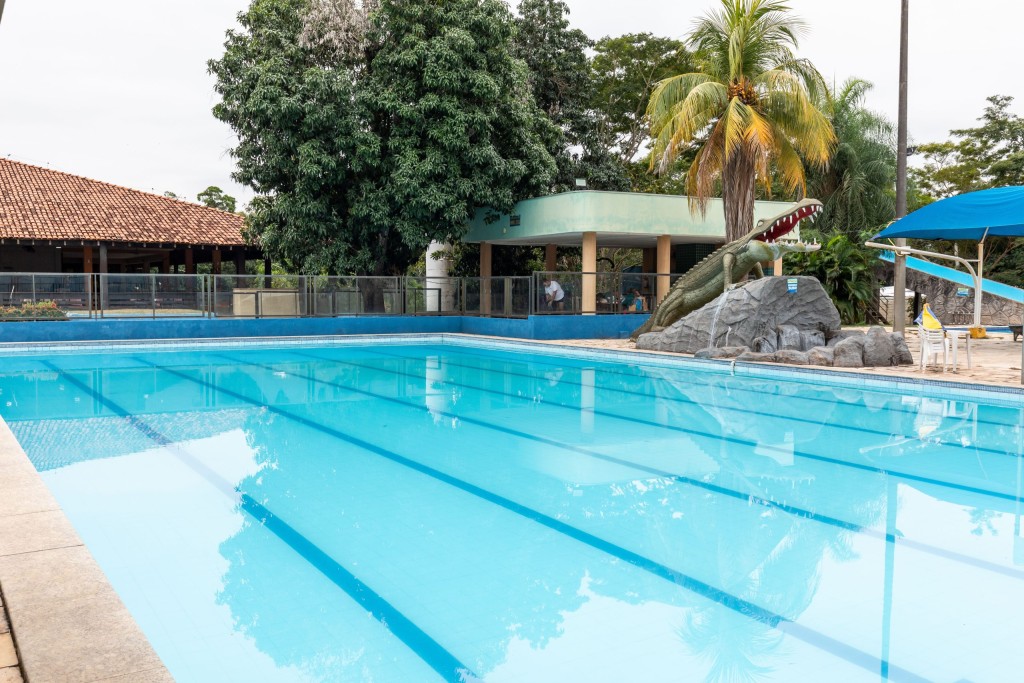 Imagem das piscinas olímpicas da Associação Atlética Banco do Brasil (AABB), com raias demarcadas e estrutura ao redor preparada para competições.