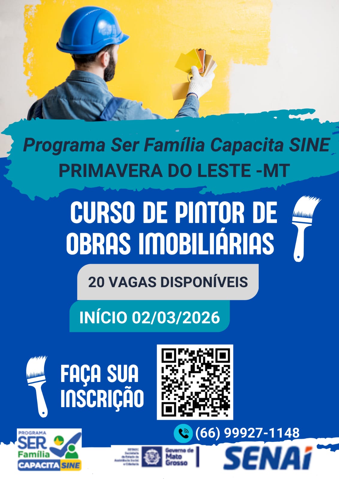 “O Curso de Pintor de Obras Imobiliárias é uma grande oportunidade de qualificação profissional para a população de Primavera do Leste, contribuindo para a geração de emprego e renda e fortalecendo a mão de obra local, além de capacitar jovens para o mercado de trabalho, proporcionando experiência ao longo do curso”, destacou.