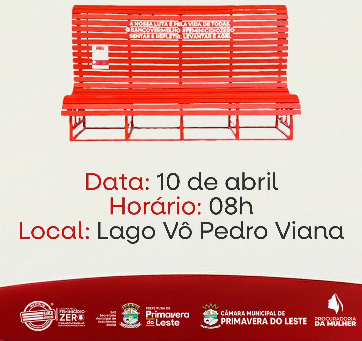 A Prefeitura de Primavera do Leste, em parceria com a Câmara Municipal, realiza no próximo dia 10 de abril a inauguração do Banco Vermelho, uma iniciativa voltada à conscientização e ao enfrentamento da violência contra as mulheres.