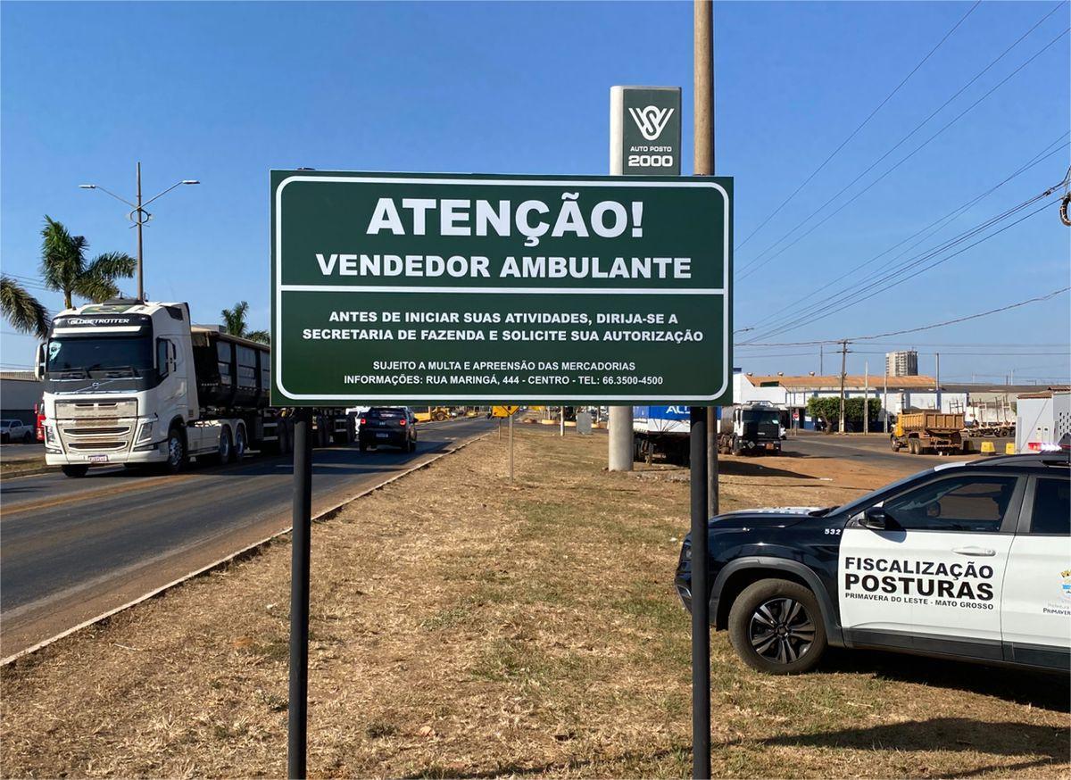 A Secretaria Municipal de Fazenda de Primavera do Leste, por meio da Divisão de Fiscalização de Posturas, instalou placas nos três acessos à cidade alertando sobre o comércio ambulante no município de Primavera do Leste. O aviso tem como foco principal os vendedores ambulantes que vem de outras cidades e a orientação principal é que essas pessoas devem procurar a Secretaria Municipal de Fazenda, antes de iniciarem suas vendas na cidade, para evitar sanções tais como a aplicação de multa e apreensão das mercadorias.
