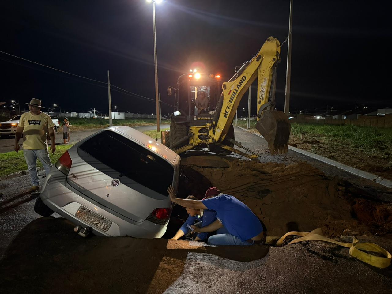 Durante as fortes chuvas registradas na tarde desta segunda-feira (27), um carro caiu em um buraco que se abriu devido ao grande acúmulo de água no bairro Poncho Verde, em Primavera do Leste.