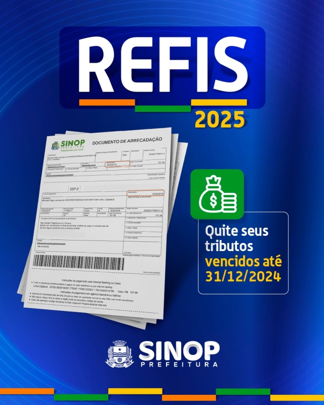 A Prefeitura de Sinop inicia nesta quarta-feira (15), a Campanha Refis 2025, com o objetivo de promover a regularização de créditos tributários e não tributários vencidos até 31 de dezembro de 2024. A ação é conduzida pela Secretaria Municipal de Finanças e Orçamento e estará disponível para adesão até o dia 15 de novembro. O programa foi instituído pela Lei Complementar nº 225/2025.