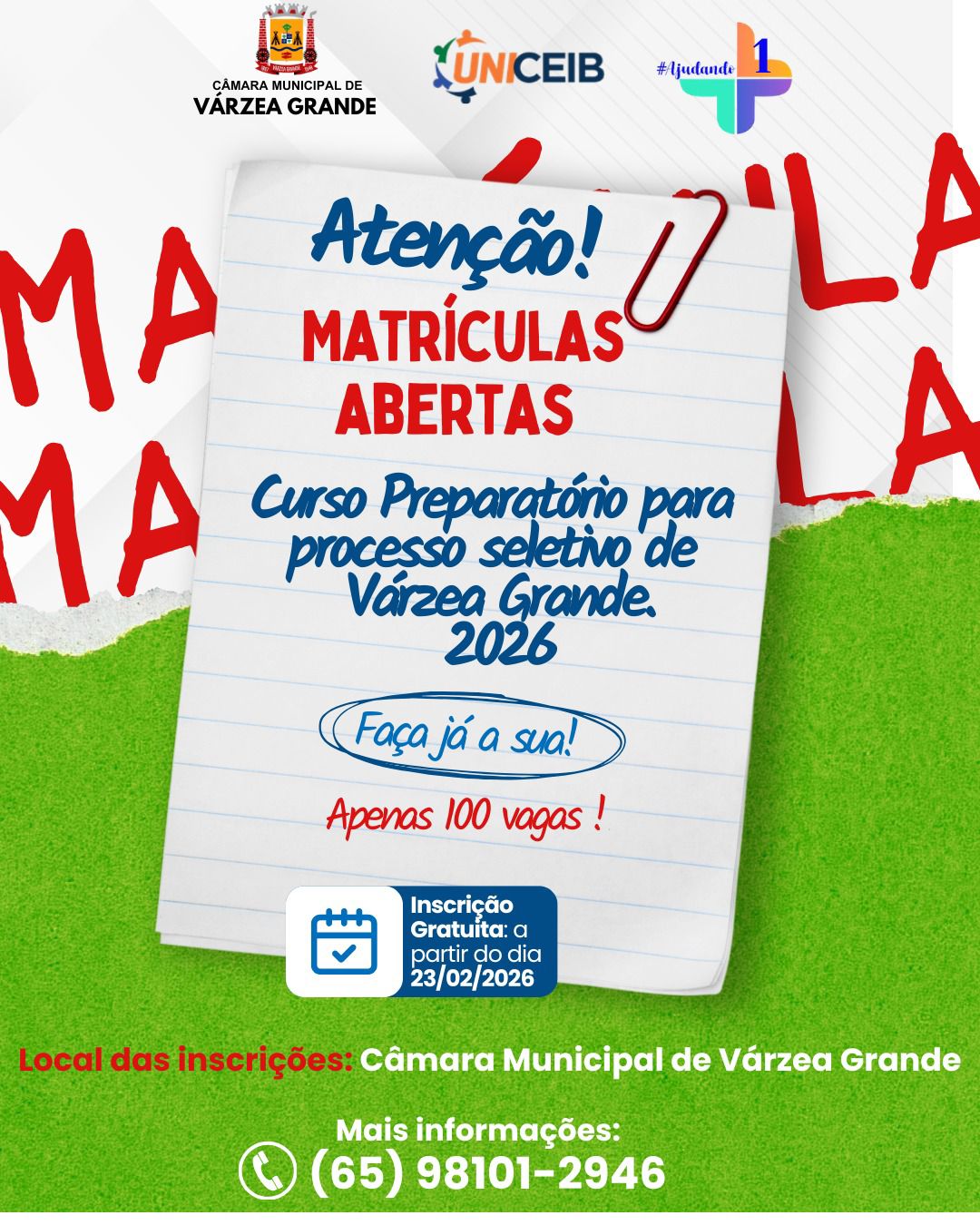 A Escola da Câmara Municipal de Várzea Grande, por meio da Secretaria de Gestão e Planejamento em parceria com a Associação e o Grupo Educacional Uniceib, está oferecendo 100 vagas para um curso preparatório para o processo seletivo de Várzea Grande. As aulas presenciais começam no dia 09/03, três vezes por semana, das 19h às 22h.