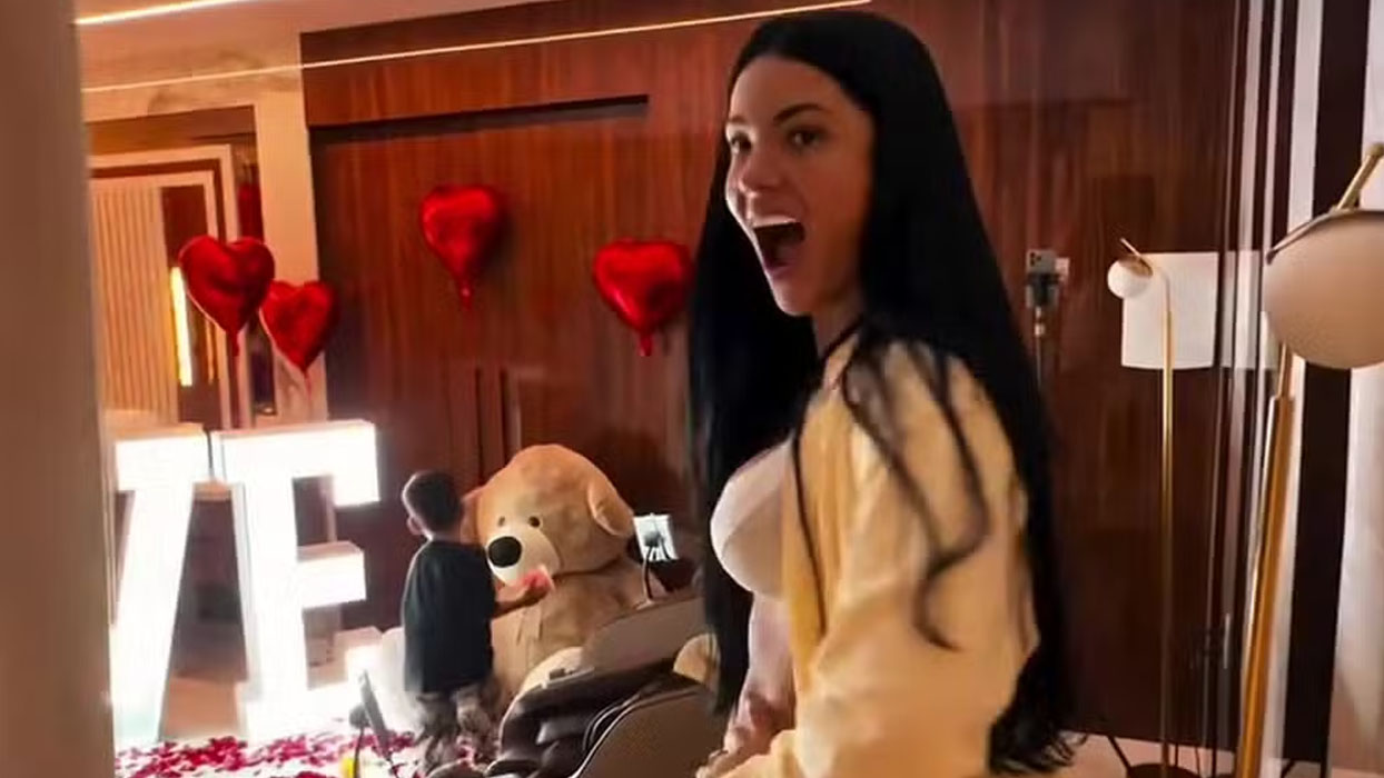 Ao chegar no quarto, acompanhada pelo filho, Zion, Rayane encontrou o ambiente completamente decorado com pétalas de rosas, buquês de flores, balões em formato de coração, fotos do casal e um letreiro iluminado com a palavra “love”. Velas, chocolates e um urso gigante completaram o clima intimista preparado pelo cantor.