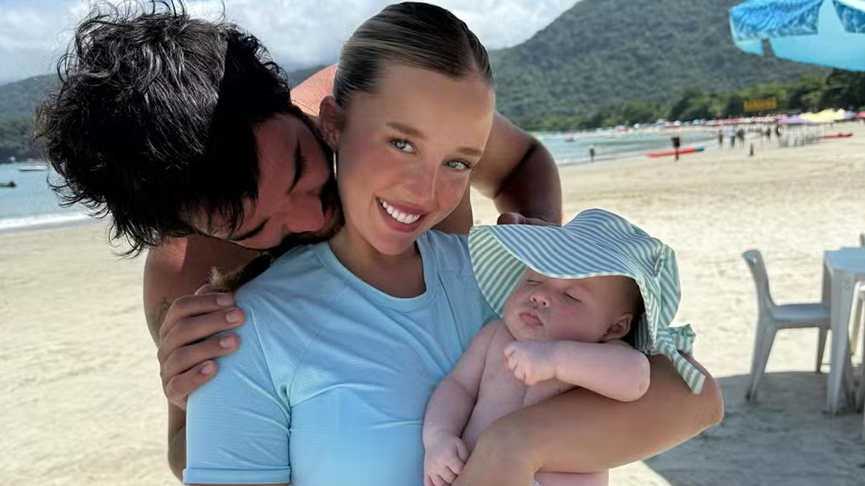 Aurora é fruto do casamento da artista, influencer e empresária de beleza com o hair stylist Du Nunes. Nas imagens, Duda aparece empurrando um carrinho de bebê na areia e também entrando no mar com a filha e o marido.