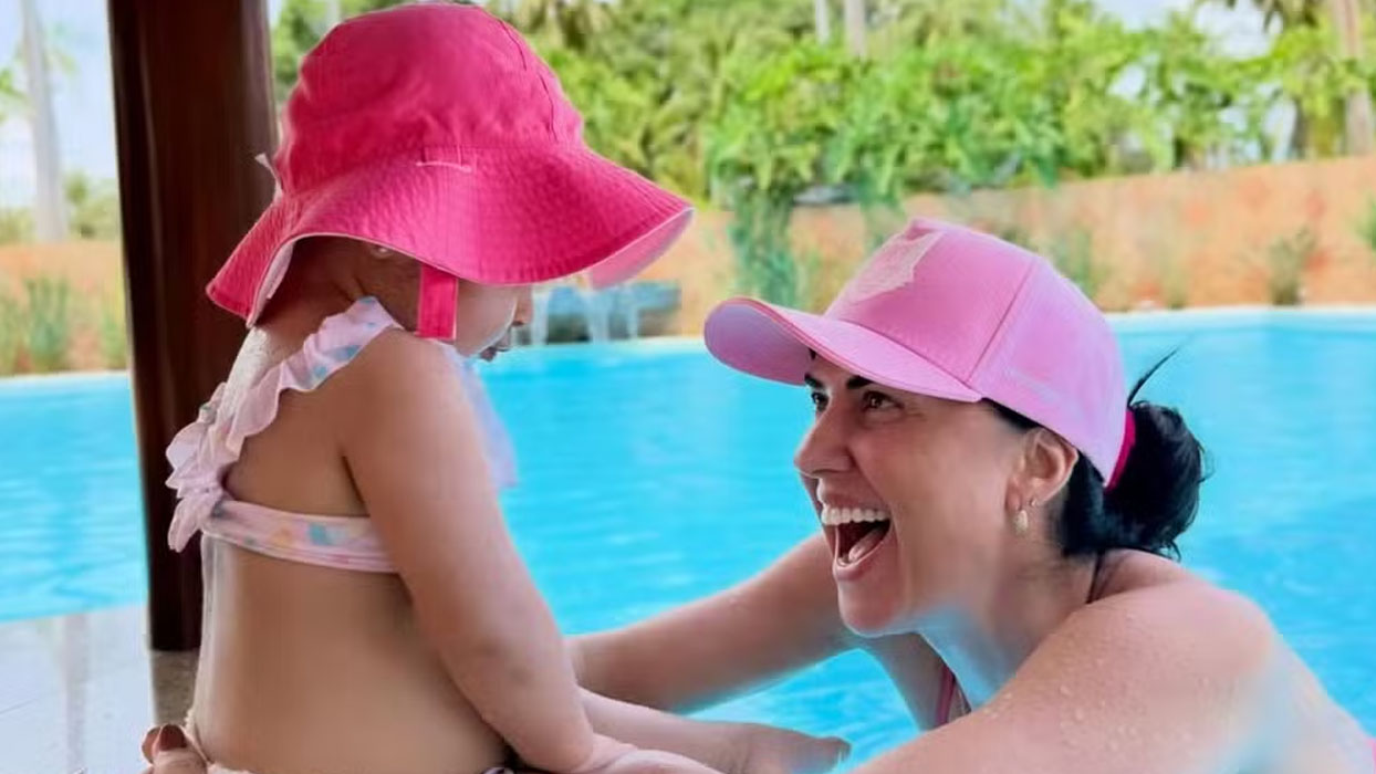 Graciele Lacerda, de 45 anos, encantou os seguidores ao compartilhar um momento especial com a filha, Clara Di Camargo, de 1 ano, fruto do casamento com Zezé Di Camargo, de 62. A pequena apareceu aproveitando a piscina durante o fim de semana ensolarado na fazenda da família, em Goiás.