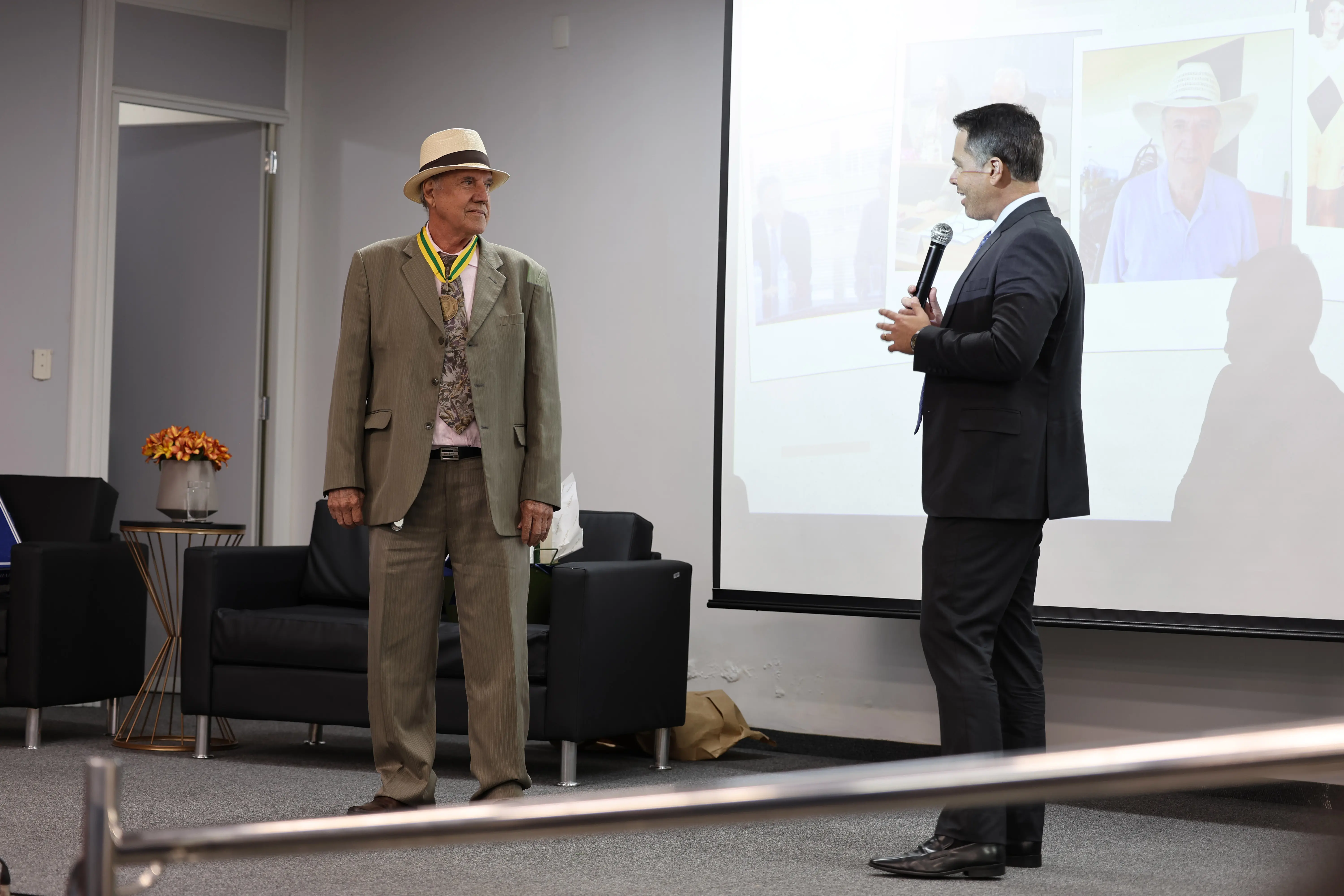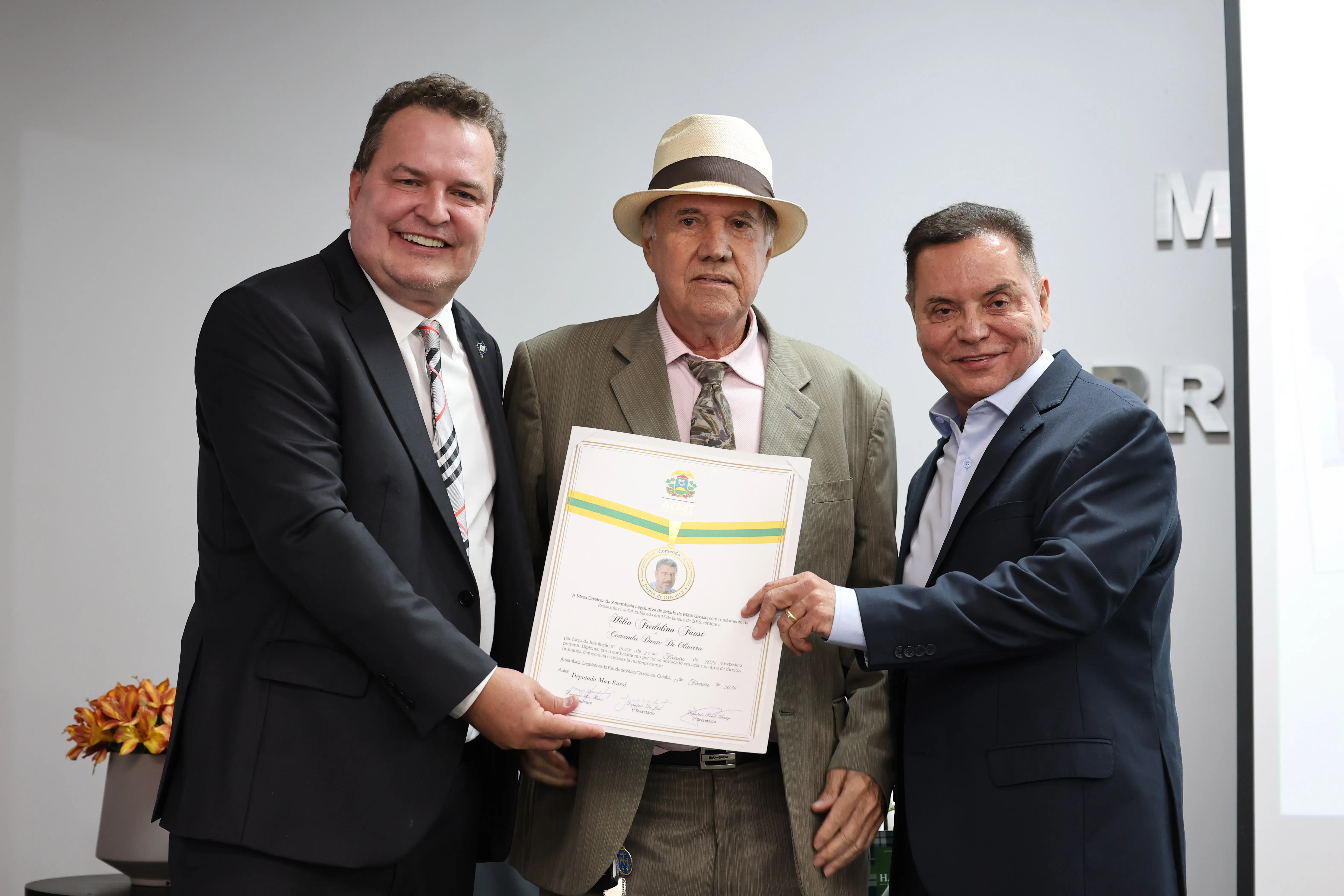 Ao final da solenidade, o homenageado recebeu a Comenda Dante de Oliveira, entregue pelos deputados estaduais Max Russi e Eduardo Botelho. A honraria é concedida a personalidades que se destacam por ações voltadas aos direitos humanos, à democracia e à cidadania mato-grossense.