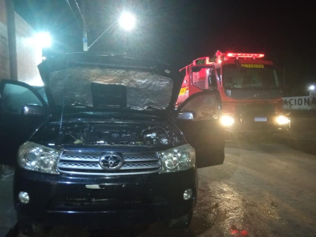 No local, os bombeiros encontraram um caminhonete com o capô aberto e grande quantidade de fumaça saindo da região do painel. Durante a avaliação, foi verificada a presença de resíduos de Pó Químico Seco (PQS) dentro e fora do veículo, indicando uma tentativa anterior de combate às chamas, além do aumento da fumaça e da temperatura na parte interna do painel.