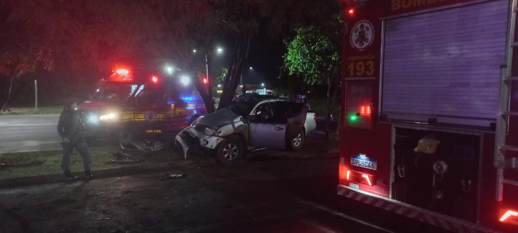 No local, os militares constataram que uma caminhonete havia colidido com uma árvore, deixando uma mulher presa às ferragens no banco do passageiro, com ferimentos na região da perna.