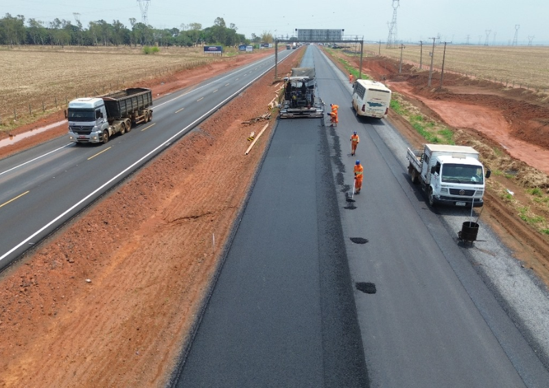 Na BR-163, uma faixa da rodovia está interditada para a realização de serviços de manutenção: