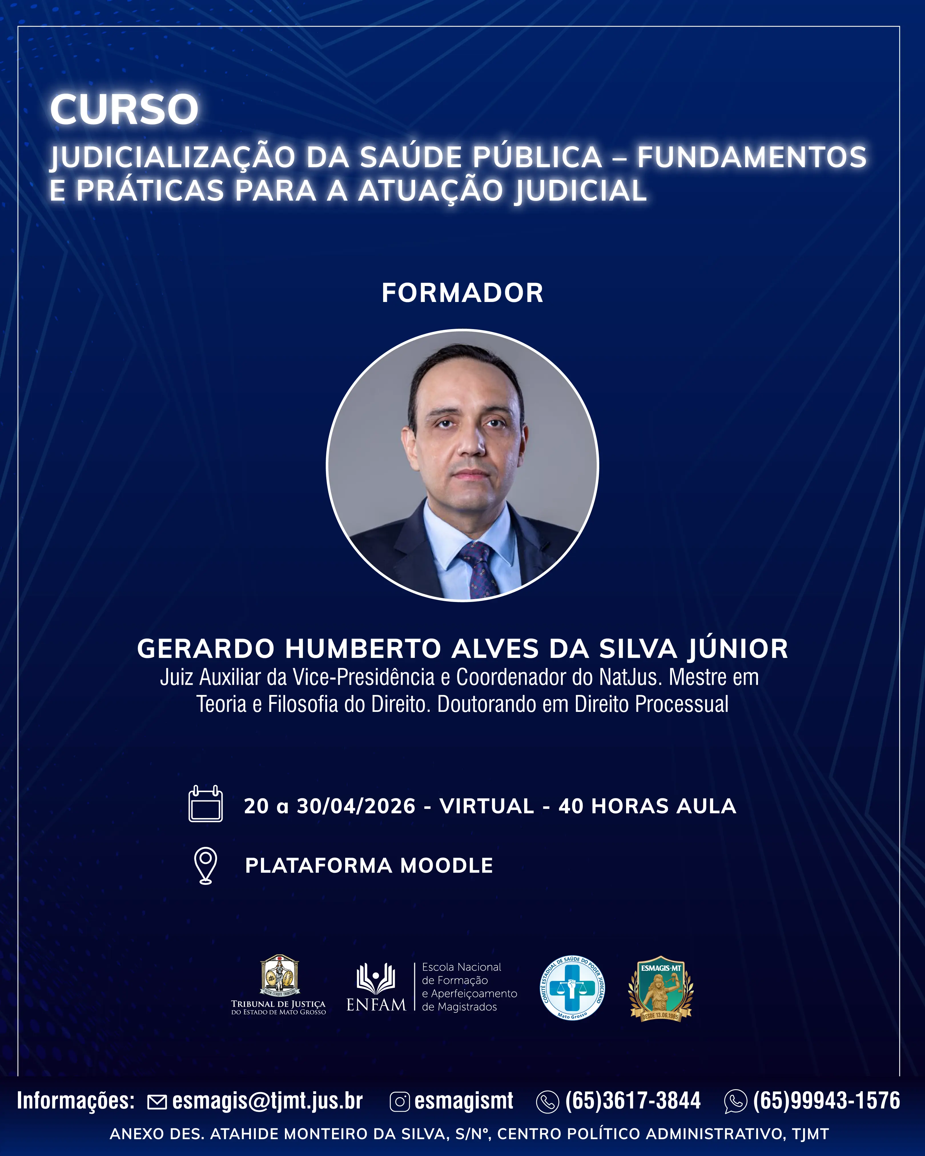 A Escola Superior da Magistratura de Mato Grosso (Esmagis-MT) comunica que estão abertas as inscrições para o curso de formação continuada “Judicialização da Saúde Pública – Fundamentos e Práticas para a Atuação Judicial”, que será ofertado na modalidade Educação a Distância.