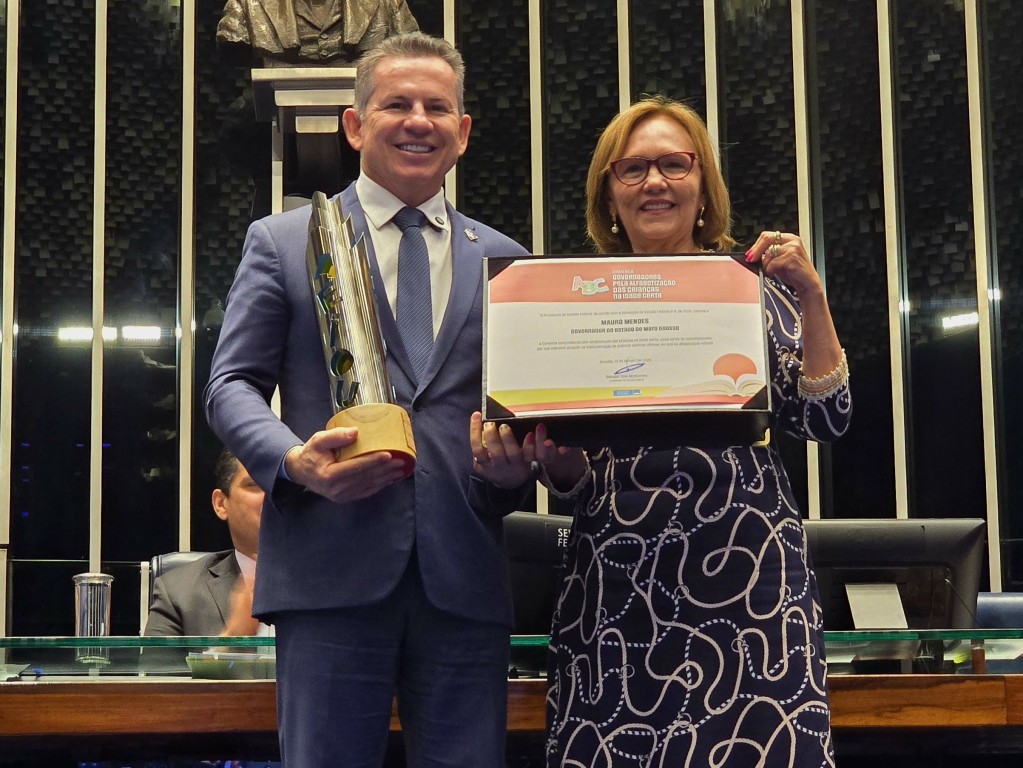 O governador Mauro Mendes foi homenageado nesta segunda-feira (13), em sessão solene no Senado Federal, com a comenda “Governadores pela Alfabetização das Crianças na Idade Certa”.