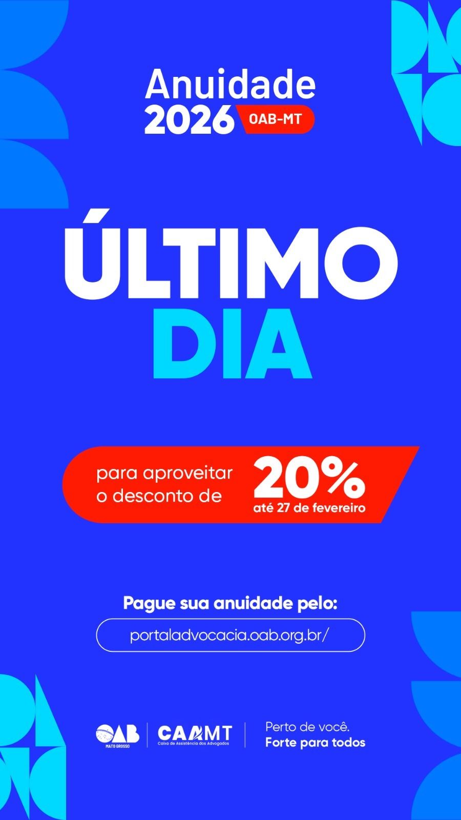Esta sexta-feira (27) é o último dia da campanha da OAB-MT para pagamento da Anuidade 2026, com 20% descontos à vista ou com o valor normal de forma parcelada. Quem optar pelo pagamento integral de 1º a 31 de março terá direito a um desconto de 10%.