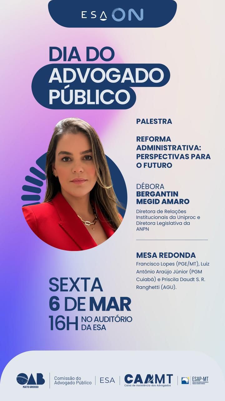 O evento será realizado às 16h no auditório da ESA, com a palestra “Reforma Administrativa – Perspectivas para o Futuro”, ministrada pela procuradora municipal de Cuiabá, Débora Bergantin Megid Amaro, diretora de Relações Institucionais da União dos Procuradores do Município de Cuiabá (Uniproc) e diretora legislativa da Associação Nacional dos Procuradores Municipais (ANPM).