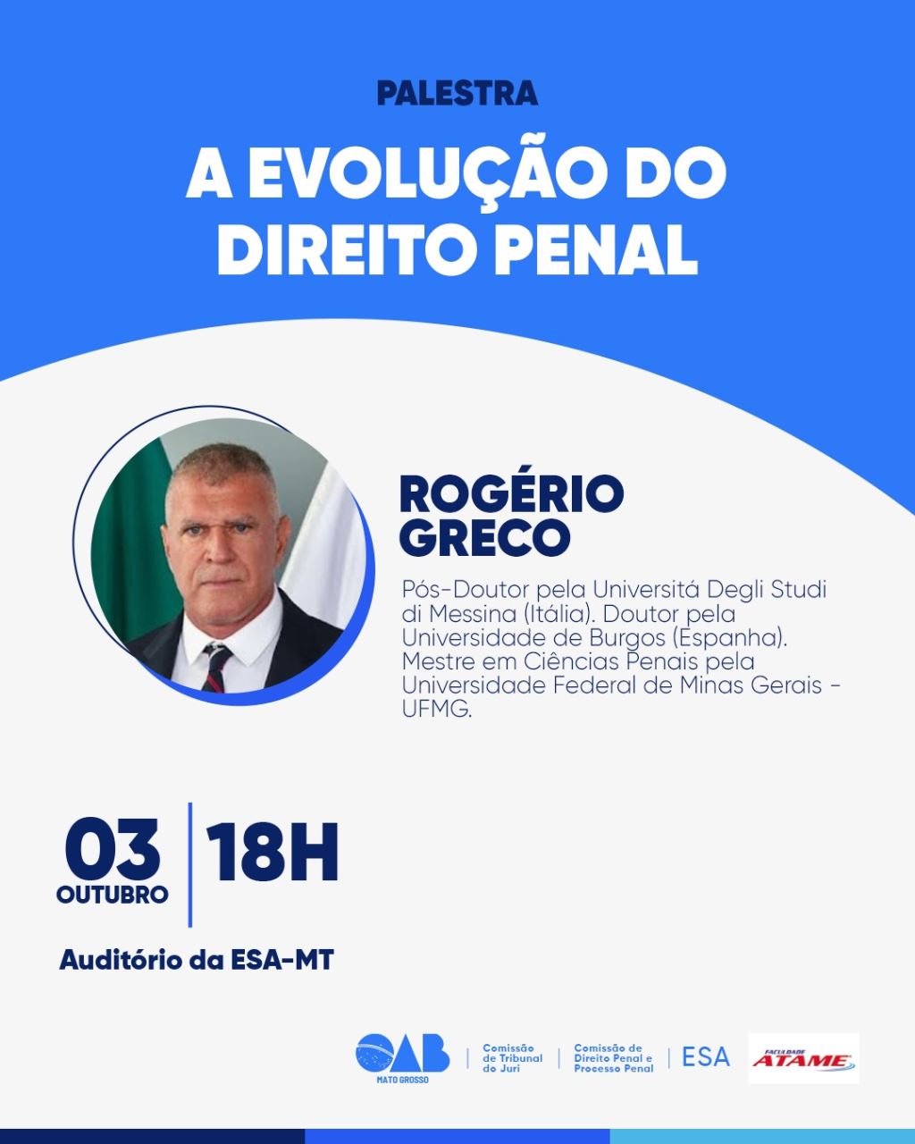 A Ordem dos Advogados do Brasil – Seccional Mato Grosso (OAB-MT) e a ESA-MT convidam para aula inaugural da nova turma da pós-graduação em Direito Penal e Processo Penal com o jurista Rogério Greco, dias 3 e 4 de outubro, em Cuiabá.