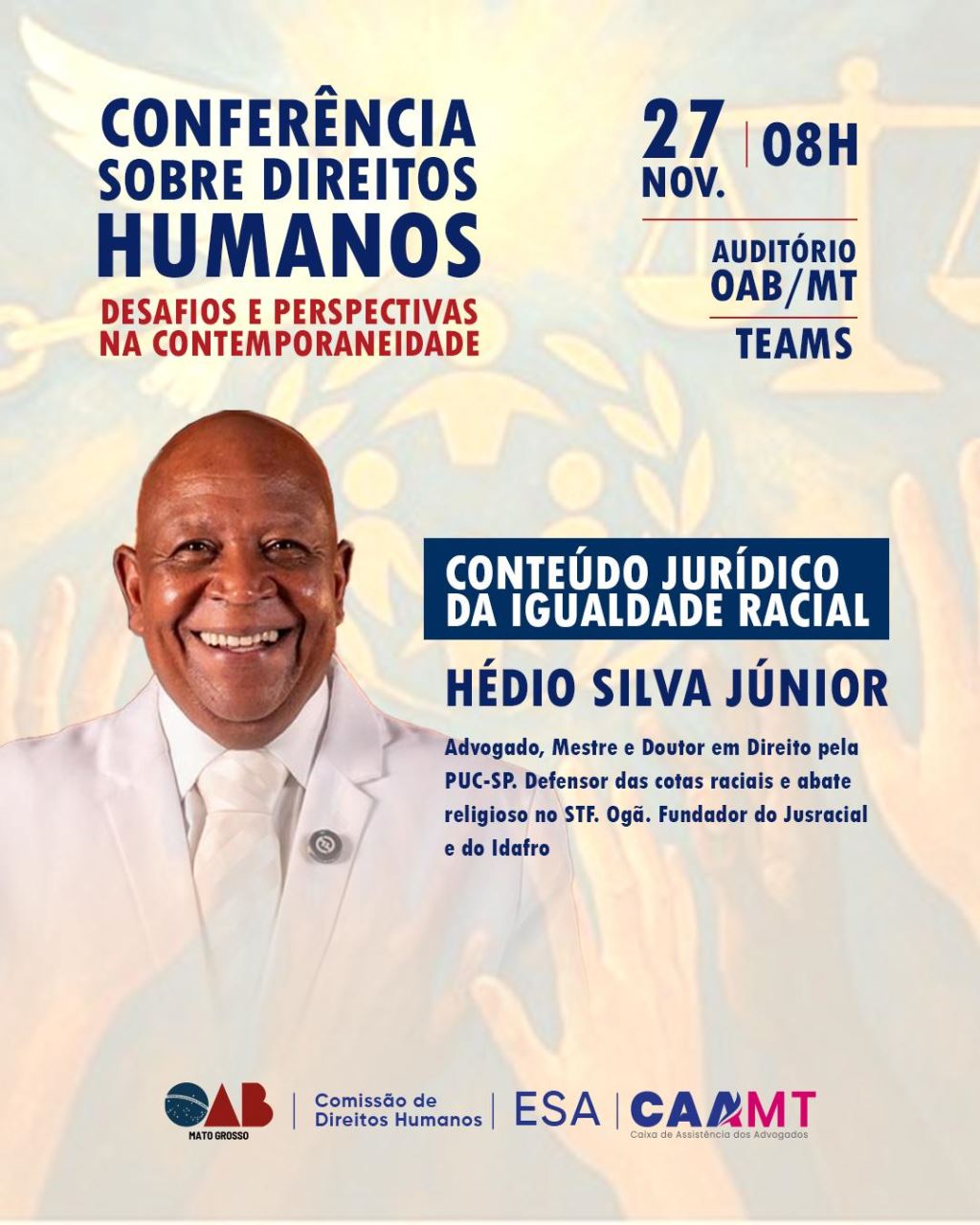 A Ordem dos Advogados do Brasil – Seccional Mato Grosso (OAB-MT), por meio da Comissão de Direitos Humanos, realiza dia 27 de novembro, a partir das 8h, a Conferência sobre Direitos Humanos – Desafios e Perspectivas na Contemporaneidade, com o tema “Conteúdo Jurídico da Igualdade Racial”, ministrada por Hédio Silva Júnior, advogado, mestre e doutor em Direito pela PUC-SP, reconhecido defensor das cotas raciais e do direito ao abate religioso no Supremo Tribunal Federal (STF).