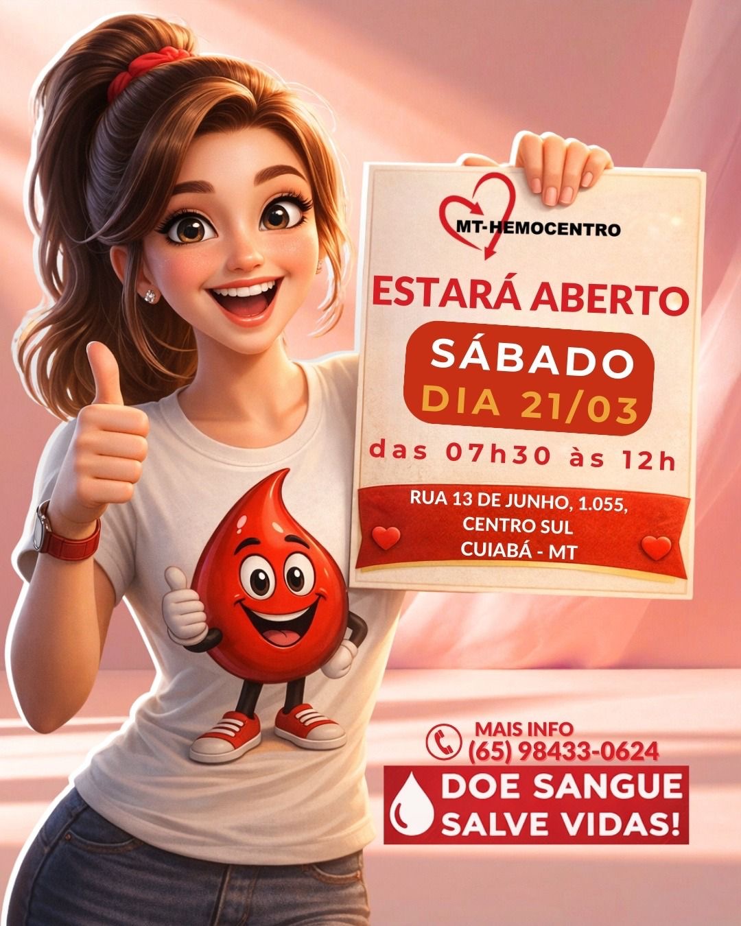 O atendimento no MT-Hemocentro, localizado na Rua 13 de Junho, ocorrerá das 7h30 às 12h. Já a Unidade de Coleta em Várzea Grande funcionará em horário ampliado, das 7h às 16h.