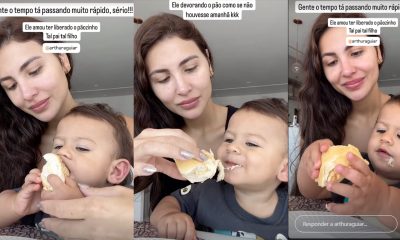 Arthur Aguiar, de 36 anos de idade, e Jheny Santucci, de 24 anos, mostraram registros do filho, Gabriel, de 1 ano de vida, comendo pão pela primeira...