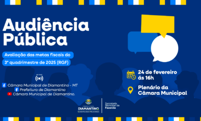 A Prefeitura de Diamantino por meio da Secretaria Municipal de Fazenda convida toda a população para participar da audiência pública de avaliação do cumprimento das metas...