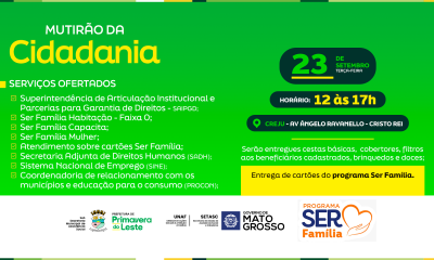 A cidade de Primavera do Leste recebe na próxima terça-feira (23) os serviços do Mutirão da Cidadania, organizado pelo Programa SER Família do Governo do Estado,...