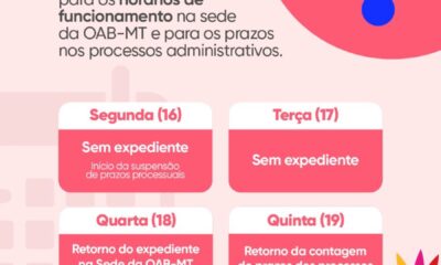 A Ordem dos Advogados do Brasil – Seccional Mato Grosso (OAB-MT) informa que, conforme a Portaria nº 003/2026, estarão suspensos o expediente institucional e os prazos...