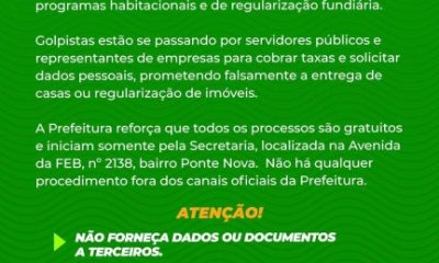 A Prefeitura Municipal de Várzea Grande, por meio da Secretaria de Desenvolvimento Urbano, Regularização Fundiária e Habitação, alerta à população sobre a atuação de golpistas que...